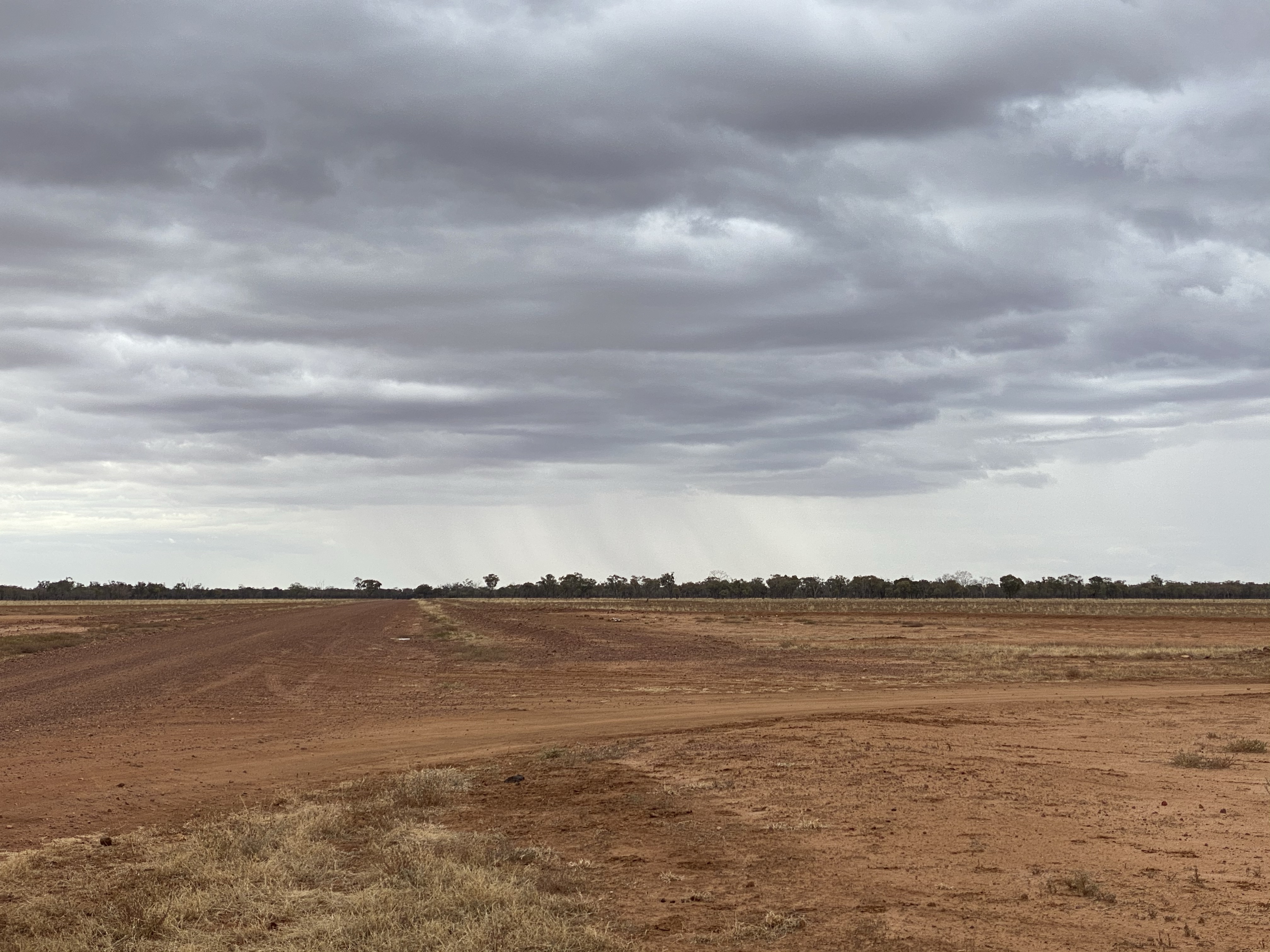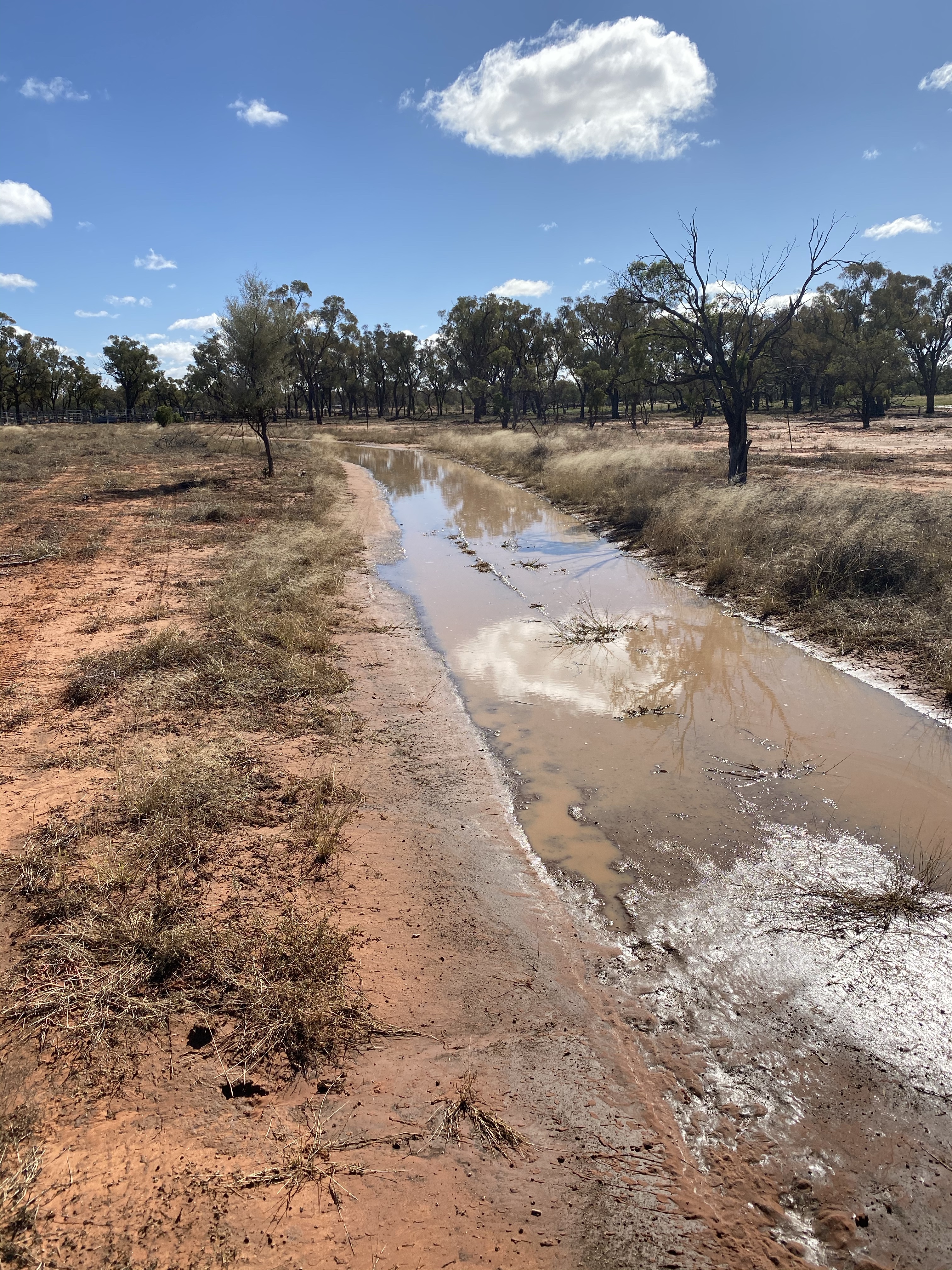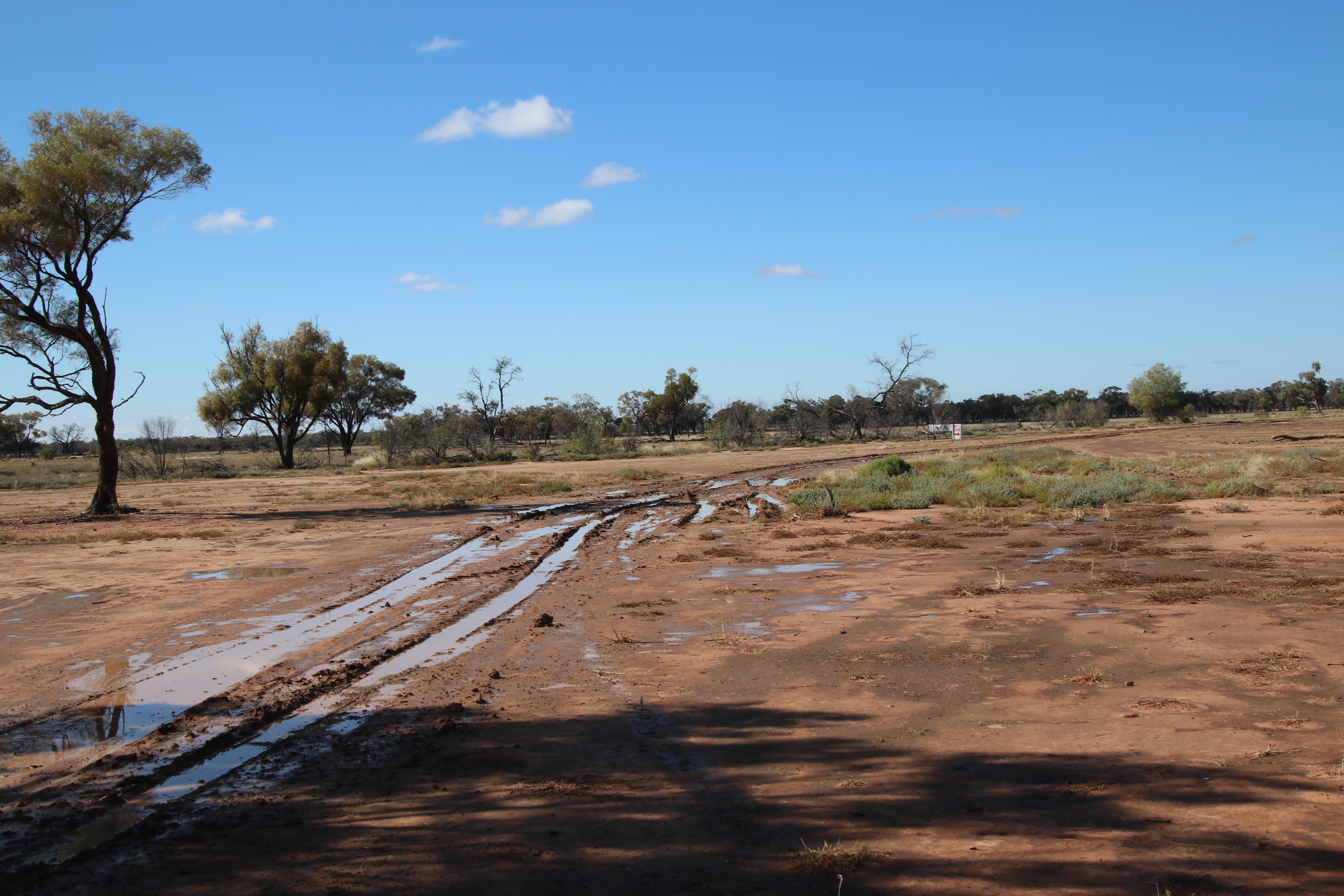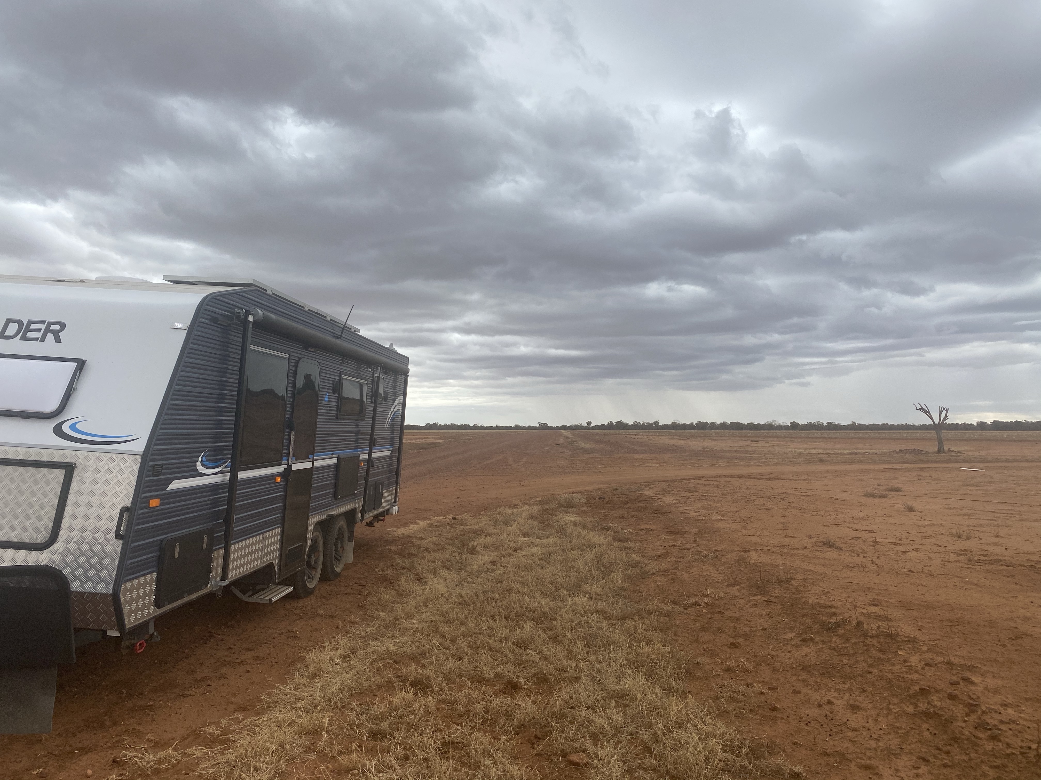 As we were driving in, there looked to be rain clouds coming in, we told ourselves not to be silly, as we’re in outback QLD in the middle of winter, of course they’re not rain clouds. Turns out about 5 minutes later it was confirmed they were rain clouds when we could actually see the rain falling from them. We’re actually lucky that we got to the campsite when we did because it decided to rain quite a bit and later that night as we were getting ready to go to bed we heard and saw a tractor which we thought was a bit strange. It all made total sense the next morning however when we spotted a camper trailer and car covered in mud that had not been there the afternoon before! There was about 6 other setups at the bore besides us and then the camper trailer. After having a campsite gathering with everyone else the next morning we all decided it had rained pretty heavy last night and wondered what the tractor had been doing. Turns out the family in camper trailer entertained us all with their story of trying to come in at 5pm and getting bogged in the very wet, sticky mud. They had a UHF on them luckily because there is no phone service what so ever and had radioed the farmstead for help. By this time it was black outside and to begin with they thought they would have to sleep in the car for the night until a man in a tractor showed up and saved the day by towing them to the campsite! The ground had literally gone from hard and dusty to wet and sticky in a matter of 2 hours, and then it had poured even more over night. We were all stuck there was no way of any of us getting back to the highway for at least a couple of days when hopefully it would dry up enough that we could all get through! I honestly couldn’t think of a nicer spot or nicer people to be stuck with though, we actually had the nicest couple of days complete with no phone service and no contact with the outside world.